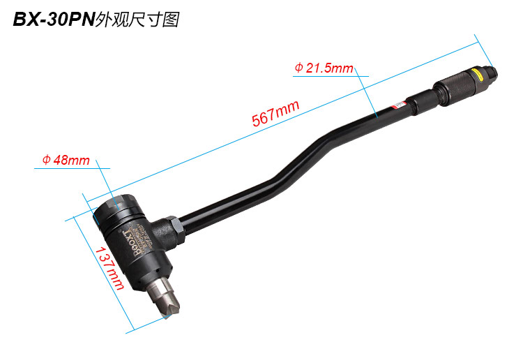 • 產(chǎn)品參數(shù): 活塞直徑:30*80mm 活塞沖程:35mm 沖擊頻率:7000b/min 耗 氣 量:3.3cfm/min 全 長:567mm 凈 重:2.28kg 【單頭/旋鈕開關(guān)】