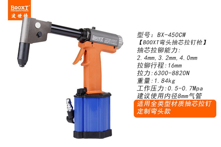 東莞市強勁五金工具有限公司提供臺灣BOOXT波世特品牌氣動工具,彎頭氣動拉鉚槍BX-450CW廠家直銷,首件享特價。咨詢熱線:4008301980