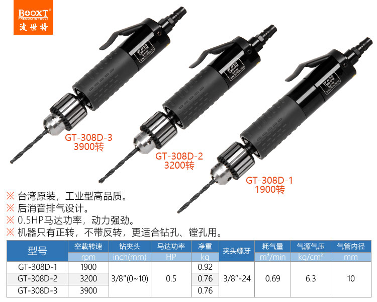 東莞市強(qiáng)勁五金工具有限公司提供臺(tái)灣BOOXT波世特品牌氣動(dòng)工具,直式氣鉆GT-308D-1廠家直銷,首件享特價(jià)。咨詢熱線:4008301980
