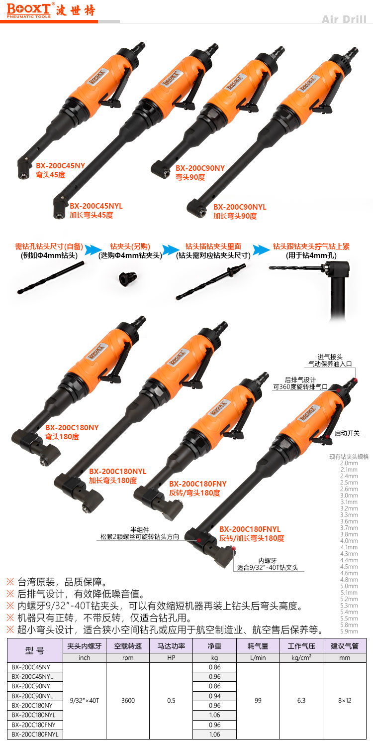 東莞市強(qiáng)勁五金工具有限公司提供臺(tái)灣BOOXT波世特品牌氣動(dòng)工具,加長(zhǎng)45度偏角氣鉆BX-200C45NYL廠家直銷,首件享特價(jià)。咨詢熱線:4008301980
