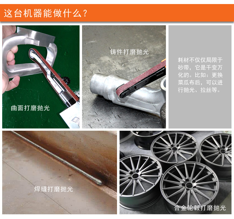 • 產(chǎn)品用途: 適用于各行業(yè)圓管和不規(guī)則工件打磨作業(yè),以及點(diǎn)焊部位焊接縫研磨打磨.去角去毛邊去毛刺。壓鑄廠/木器廠/鈑金廠/不銹鋼廠/鋼管鐵具家具廠等拋光,打磨,拉絲,倒角等作業(yè).【套裝/工業(yè)型】