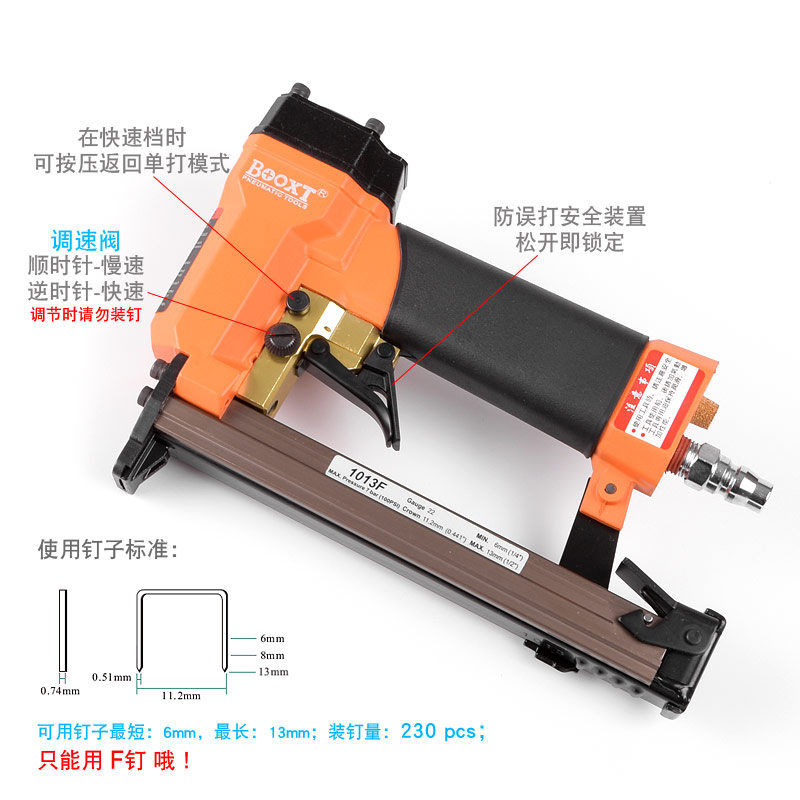 • 產(chǎn)品參數(shù): 特點:可調(diào)節(jié)快速連打,自帶防誤打安全開關(guān);釘子寬度:11.2mm;釘子跨度:10mm;釘腳尺寸:0.51×0.74mm;使用釘子長度范圍:6-13mm;裝釘量:230個;使用工作氣壓:0.6Mpa;推薦使用內(nèi)徑6.5mm氣管;平時多注意定時排放空壓機水份